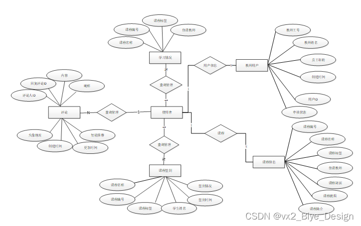 下面是整个计算机课程教学辅助系统小程序中主要的数据库表总E-R实体关系图。