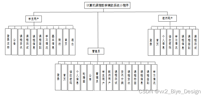 按照计算机课程教学辅助系统小程序的角色,我划分为了学生用户管理模块、教师用户管理模块和管理员管理模块这三大部分。