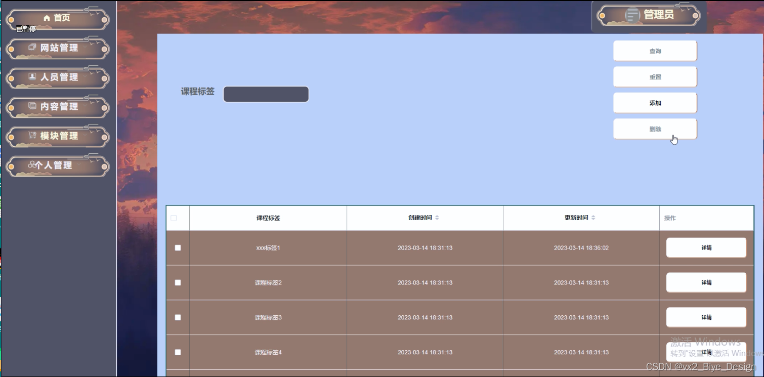 (4)模块管理:在“模块管理”这一菜单下可以对系统当中的学生、教师操作的所有信息进行管理,包含了课程标签、课程信息、课程签到、学习情况。