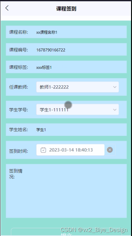 (6)课程签到:点击“课程签到”后跳转到课程签到提交界面,选择签到情况,输入课程名称、课程编号、课程标签、任课教师、学生学号、学生姓名、签到时间,然后点击提交课程签到就完成了。