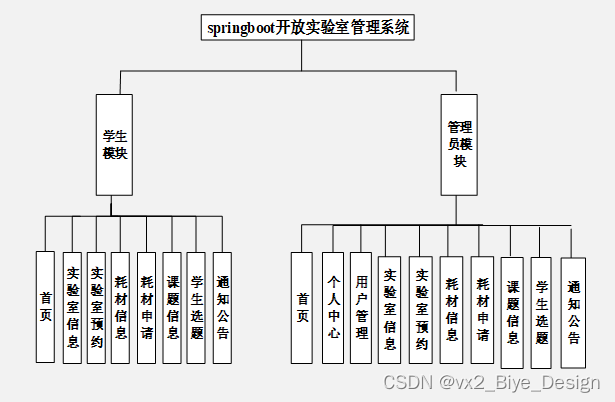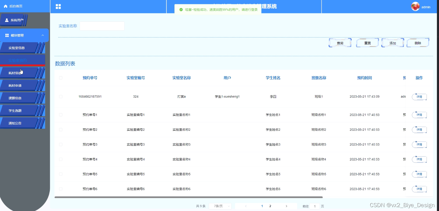 开放实验室管理系统在系统的平台上可以运行,主要实现了管理员后端;首页、系统用户(管理员、学生用户)模块管理(实验室信息、实验室预约、耗材信息、耗材申请、课题信息、学生选题、通知公告);学生用户功能;首页、实验室信息、耗材信息、耗材申请、课题信息、学生选题、通知公告管理模块的操作和管理。