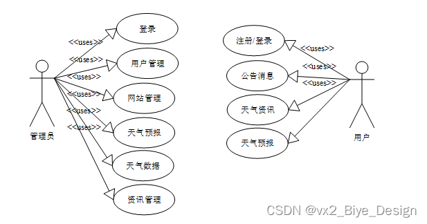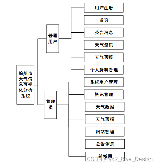 天气信息可视化分析系统的功能主要分为前台用户根据自己的需求进行注册登录,浏览天气信息并对选中的天气进行搜索操作。后台系统管理员因职责的不同,管理员主要对注册用户,天气预报、天气数据进行处理。