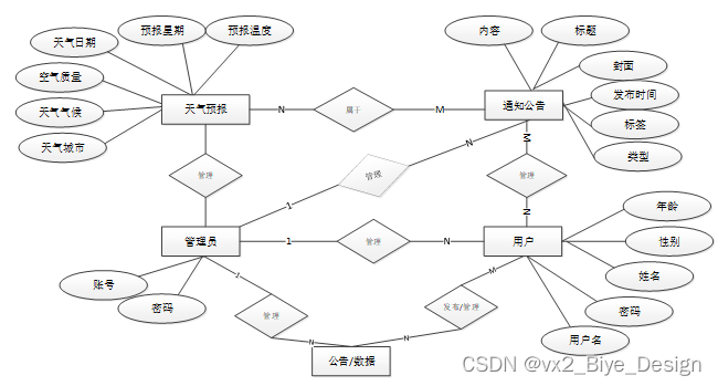 从前面可以分析到数据库中最重要的是天气信息,用户信息,管理员信息。分析可以得到如下数据描述: