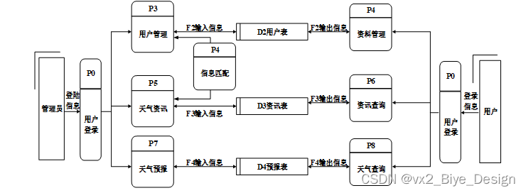 天气信息可视化分析系统总体分为前台用户模块和后台管理员模块。
