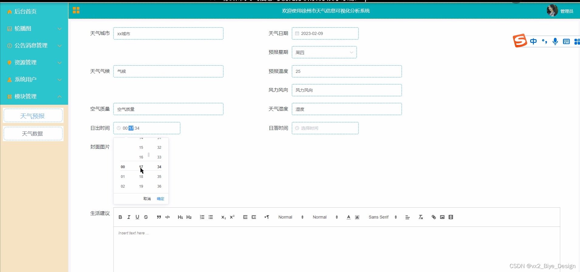 天气信息管理:对天气信息信息进行维护,添加、删除、修改信息。