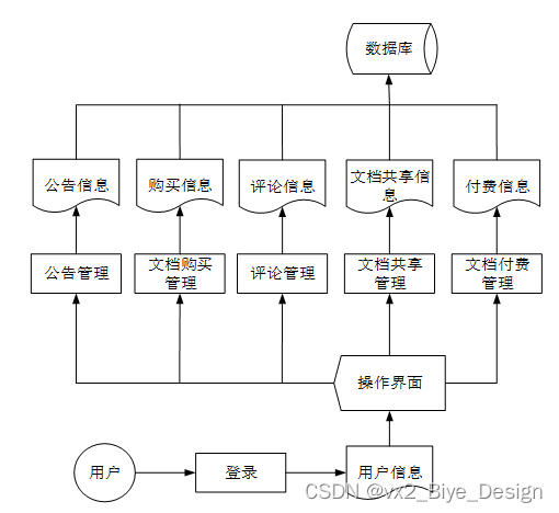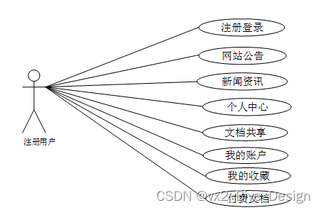 (1)用户注册登录:游客可以随时进入到系统中,对系统中的信息浏览,但是想要实现付费文档以及文档共享等操作,就必须有这个系统的账号,如果没有账号的话,可以注册以后进行相关的操作,同时用户还可以通过“我的账户”这以按钮对个人信息以及操作的信息进行管控。