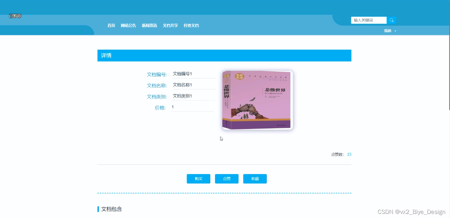 (7)付费文档:用户可以查看付费文档,在查询到自己想要了解的付费文档的时候,可以进入查看详细的介绍,点击“购买”这一按钮以后会跳转到购买信息填写的界面,根据提示填写好购买的信息,点击“提交”以后购买就完成了,在付费文档详情这个界面,同时支持用户对喜欢的付费文档进行收藏、点赞的功能。
