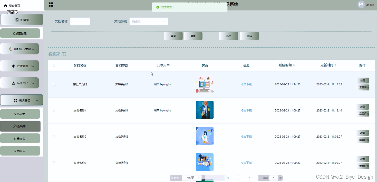 (4)模块管理:当点击“模块”这一菜单的时候,会出现文档分类+文档共享+付费文档+文档购买这四个子菜单,管理员能够对这四个模块进行增删改查操作;