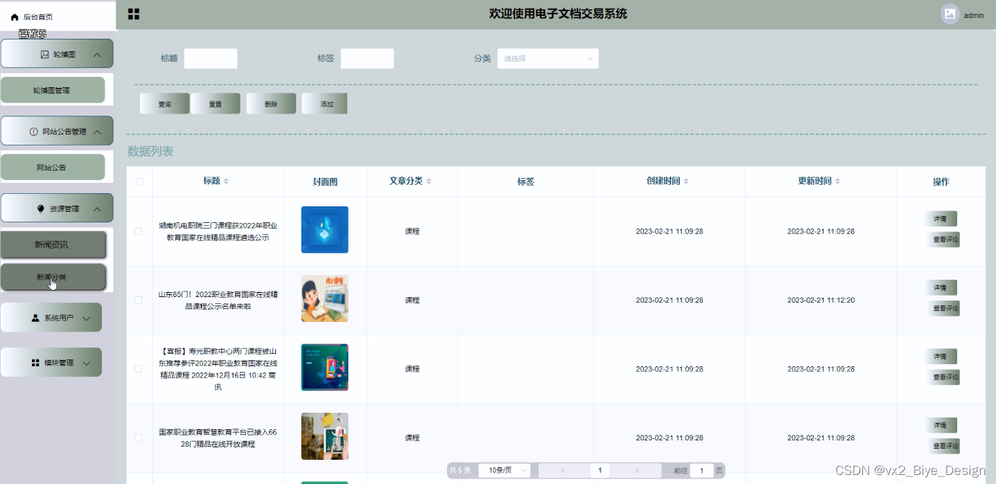 The electronic document trading system takes MySQL as the main storage unit of the background data, uses software engineering principles and development methods, and uses the Java technology of spring boot to build a management system, which realizes all the functions of the system. Complete the page design and function realization of the main modules of the system. This article shows the implementation effect of the home page, and introduces the implementation process of user registration function, document classification, document sharing, paid document, document purchase and other functions through the code and page.