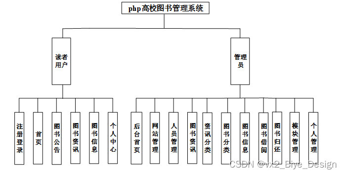 (3)确定好系统使用的技术,进行在线确认系统所划分的用户角色,并且根据用户角色划分确定所要设计的功能模块,对于高校图书管理系统的设计主要划分别为管理员和读者用户角色,并所使用的功能模块也相应不同,但是系统的数据库实现的内容是交互的,用户可以随时根据自己的需求进行信息搜索,对于系统工作人员可以根据自己的分管内容进行在线信息的处理及操作,管理员获取到所有用户的详细数据信息,并根据需求进行第一时间处理解决。