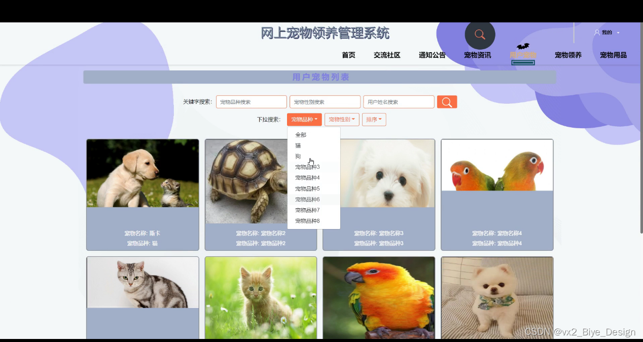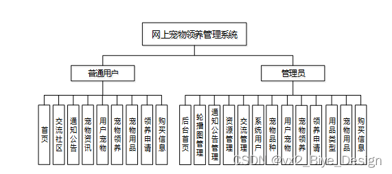 (1)功能要求:首页,轮播图管理,通知公告管理,资源管理(宠物资讯,资讯分类),交流管理(交流社区,社区分类),系统用户(管理员,普通用户),模块管理(宠物品种,用户宠物,宠物领养,领养申请,用品类型,宠物用品,购买信息)等功能模块。