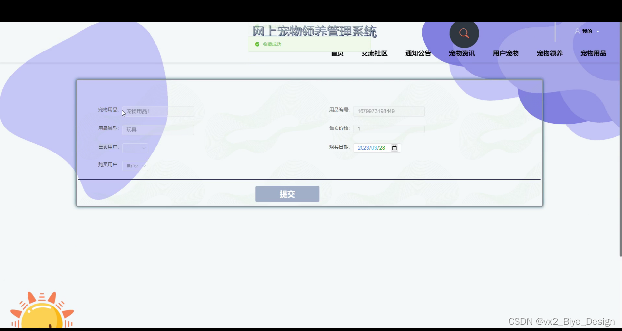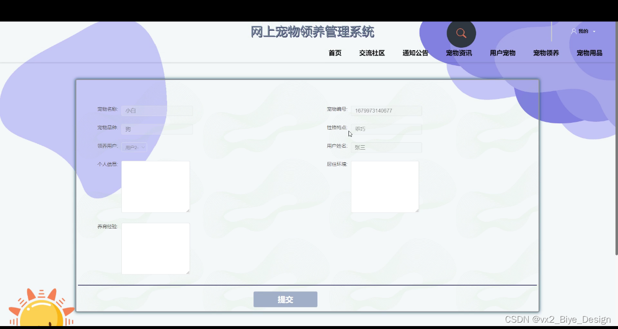 普通用户登录网上宠物领养管理系统,功能为:首页,交流社区,通知公告,宠物资讯,用户宠物,宠物领养,宠物用品,后台首页,模块管理(用户宠物,领养申请,宠物用品,购买信息)等功能,如下图所示: