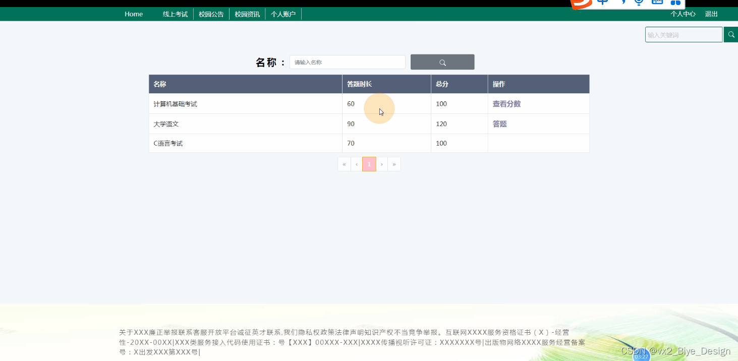 在线考试系统主要功能模块包括登录、首页、网站管理(轮播图、校园公告)人员管理(管理员、考生用户、教师用户)内容管理(校园资讯、资讯分类、线上考试)模块管理(成绩录入)、用户账号维护,采取面对对象的开发模式进行软件的开发和硬体的架设,能很好的满足实际使用的需求,完善了对应的软体架设以及程序编码的工作,采取MySQL作为后台数据的主要存储单元,采用PHP技术、Ajax技术进行业务系统的编码及其开发,实现了本系统的全部功能。本次报告,首先分析了研究的背景、作用、意义,为研究工作的合理性打下了基础。针对在线考试系统的各项需求以及技术问题进行分析,证明了系统的必要性和技术可行性,然后对设计系统需要使用的技术软件以及设计思想做了基本的介绍,最后来实现在线考试系统和部署运行使用它。