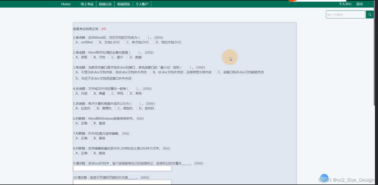 系统能自动给考生选题,考题必须是随机分配的,以保证考试的公平性。考生在考试过程中页面将提供考试时间倒计时功能,使考生随时了解考试剩余时间。在考试时间到时,系统将自动地将考生考试试卷提交,将提醒考生离开考场。当考试试卷提交时,系统自动为选择题、判断题、多选等客观题评分。