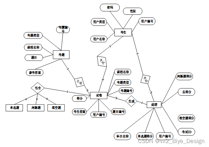试卷:存储用户的试卷信息。包括试卷的试卷编号、课程名称、单选题、判断题、多选题、开始日期、结束日期等数据项。