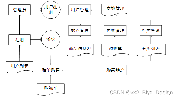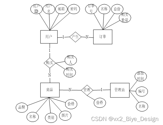 在图中,用户购买鞋子,关系为1:N,用户对鞋子的管理,包括鞋子价格、数量等,关系为1:N,用户将要买的鞋子加入购物车,关系为1:1,用户拥有自己的订单,关系为1:N。