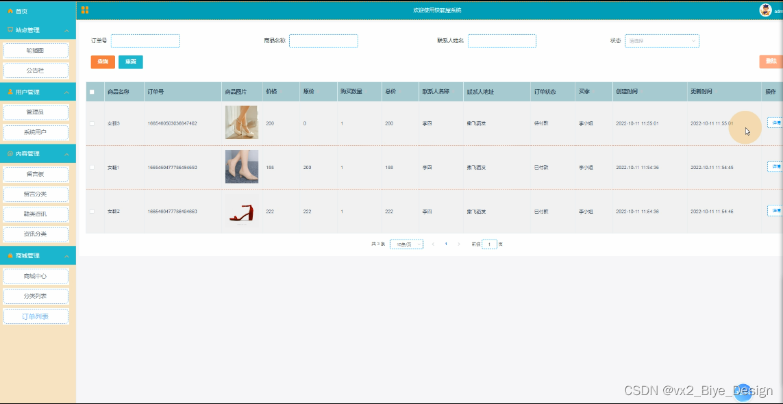 - 订单管理:订单是前台生成的,后台可以对订单的状态进行一些改变,同时,买家的售后申请操作,卖家可以批准或删除。