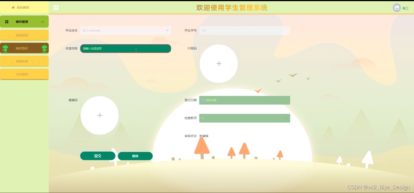 (5)防控登记:在“防控登记”这一菜单,我们点击进入进去以后,可能搜索学生姓名和学生学号进行查看或编辑体温信息、行程码、健康码、登记日期等内容进行提交,等待教师审核回复;