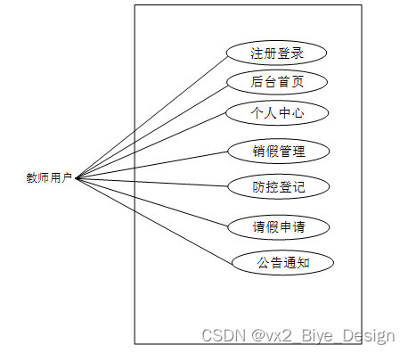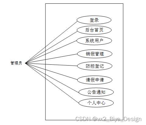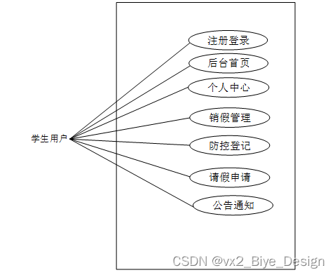 系统设计的目的是分析系统包括的所有功能结构,为开发人员设计开发和实现系统做好准备工作。经过前期的需求调查、分析和整理之后,确定的总体需求主要包括多个模块,分别是:后台首页、个人资料(个人信息、修改密码)、系统用户(管理员、教师用户、学生用户)、模块管理(销假管理、防控登录、请假申请、公告通知)。系统整体角色分为三个部分,一是学生用户、二是管理员、三是教师。系统功能结构图如下图所示。