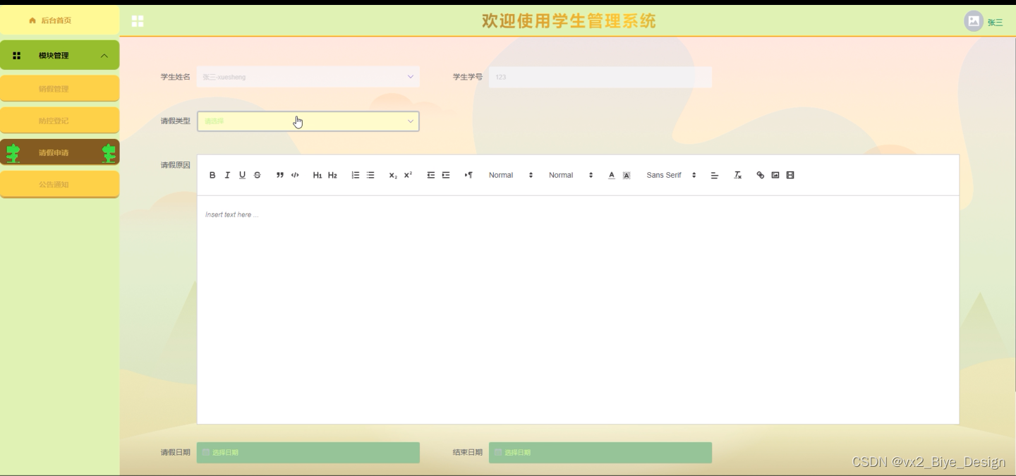 (6)请假申请:在“请假申请”这一菜单,我们点击进入进去以后,可以选择请假类型和请示老师,编辑请假原因、开始日期、结束日期等详细内容进行提交,等待教师审核回复;