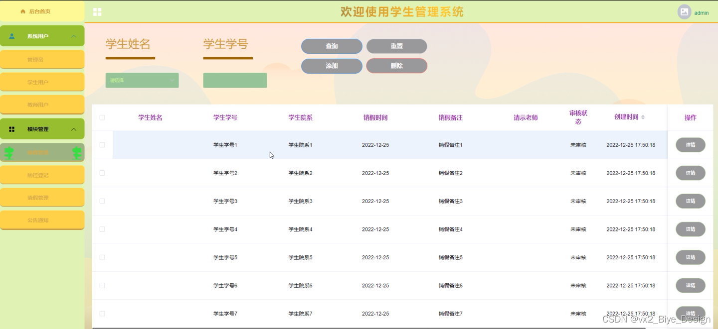 本系统主要采用了Java技术,将所有业务模块采用以浏览器交互的模式,选择MySQL作为系统的数据库,开发工具选择My eclipse来进行系统的设计。基本实现了学生管理系统 应有的主要功能模块,本系统有管理员、教师用户、学生用户。管理员:后台首页、个人资料(个人信息、修改密码)、系统用户(管理员、教师用户、学生用户)、模块管理(销假管理、防控登录、请假申请、公告通知)。学生用户;后台首页、个人资料(个人信息、修改密码)模块管理(销假管理、防控登录、请假申请、公告通知)。教师:后台首页、个人资料(个人信息、修改密码)模块管理(销假管理、防控登录、请假申请、公告通知)等功能模块。