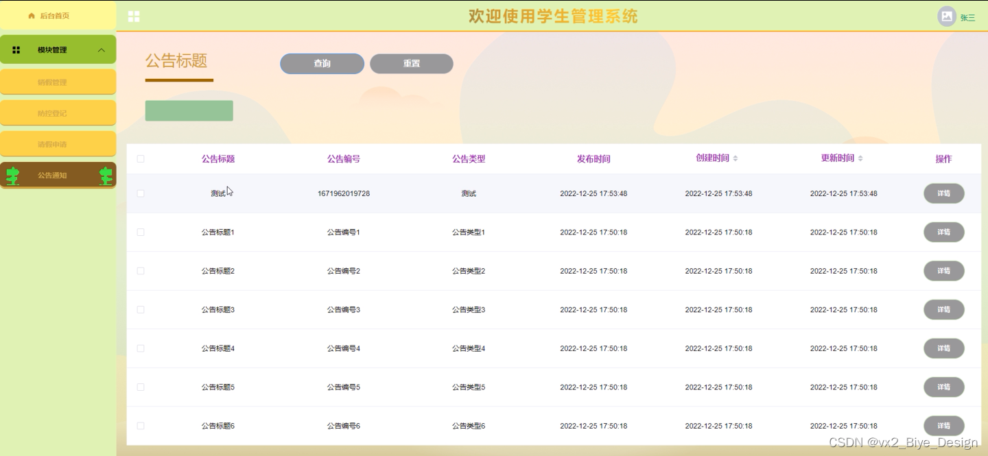 (3)模块管理:当点击“模块管理”这一菜单的时候,会出现公告通知+防控登记+请假申请+销假管理,这四个子菜单,能够对这四个模块进行增删改查等操作。