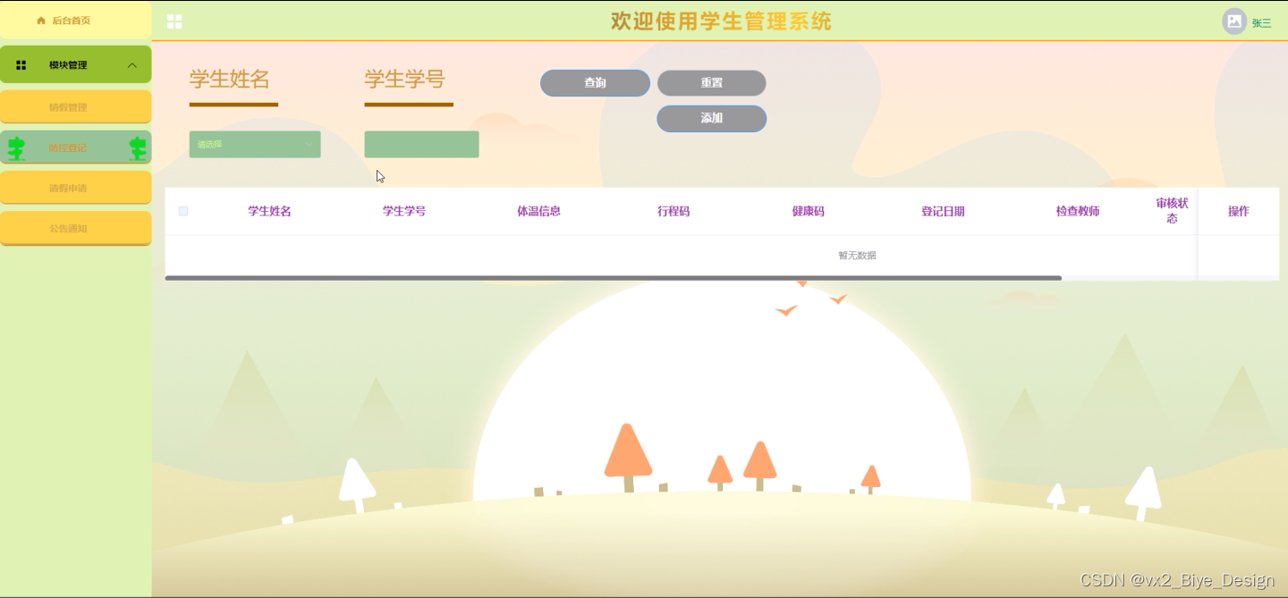 (4)模块管理:当点击“模块管理”这一菜单的时候,会出现公告通知+防控登记+请假申请+销假管理,这四个子菜单,能够对这四个模块进行删改查等操作。