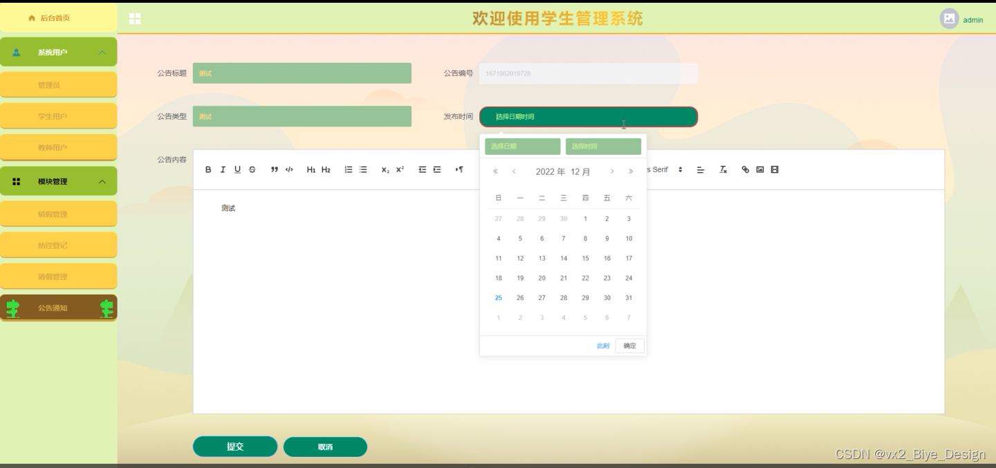 The system mainly adopts Java technology, adopts browser interaction mode for all business modules, selects MySQL as the system database, and selects My eclipse as the development tool to design the system. The main function modules of the student management system have been basically realized, including administrator, teacher user and student user. Administrator: background home page, personal data (personal information, password modification), system users (administrator, teacher user, student user), module management (leave cancellation management, anti-control login, leave application, announcement notice). Student users; Background home page, personal data (personal information, password modification) module management (leave cancellation management, prevention and control login, leave application, announcement notice). Teacher: background home page, personal data (personal information, password modification) module management (leave cancellation management, prevention and control login, leave application, announcement notice) and other functional modules.