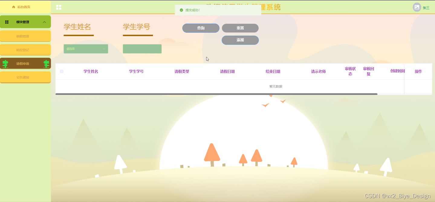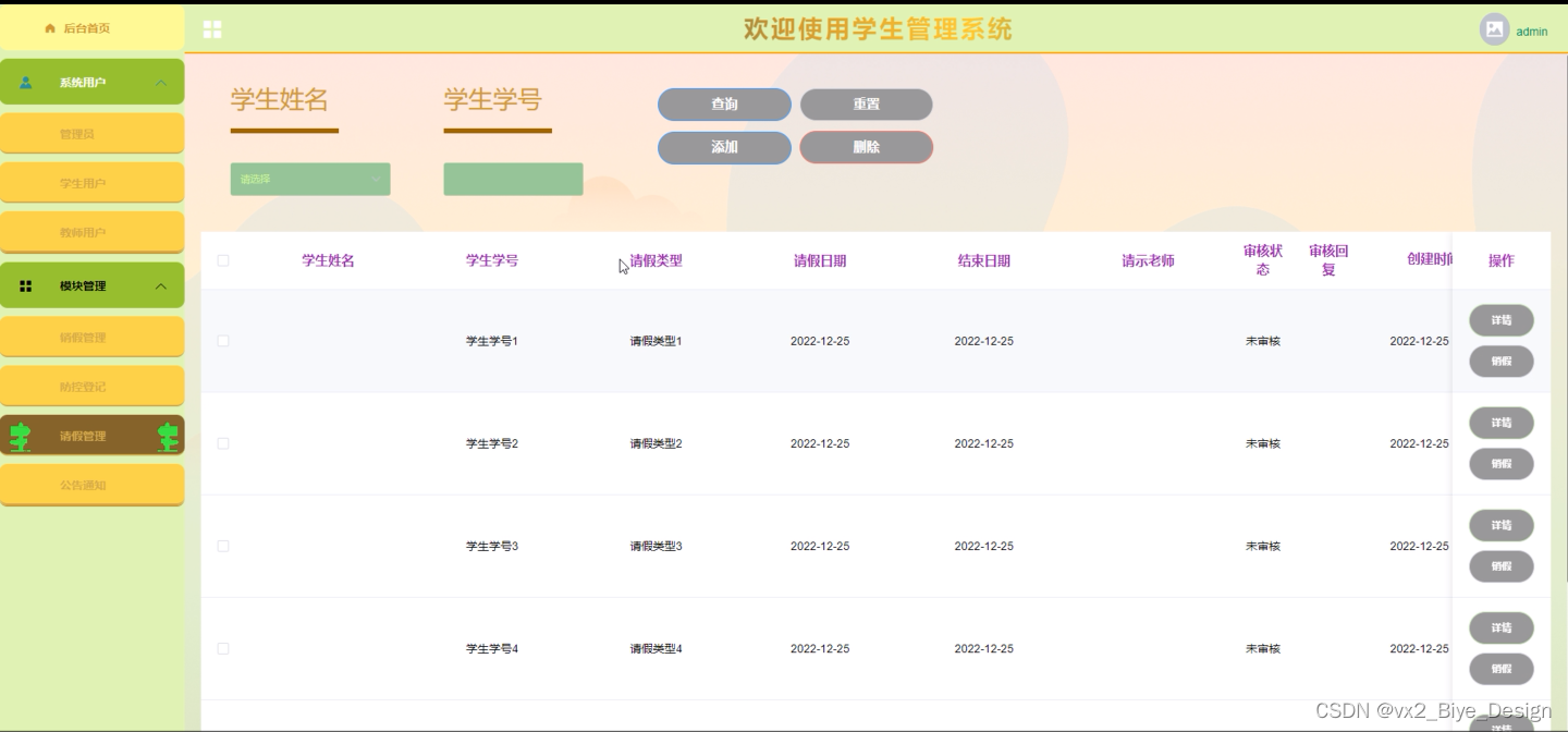 请假管理:管理员可在请假管理这一栏通过搜索学生学号和学生姓名进行查看请假类型、请假日期、结束日期、请示老师等详细信息,可根据需要进行增删改查等操作,论文题目界面如下图所示。