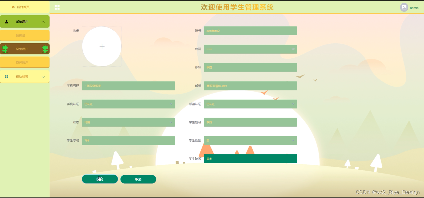 (2)系统用户管理:当点击“系统用户管理”这一菜单的时候,会出现管理员+教师+学生用户三个子菜单,可以对这三个模块进行增删改查操作;