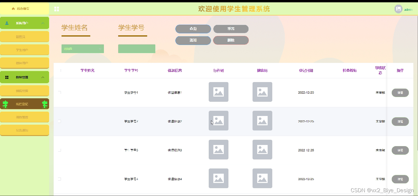 防控登记:管理员可在“防控登记”这一栏可通过搜索学生姓名和学生学号进行查看学生姓名、学生学号、体温信息、行程码、健康码、登记日期、检查老师、审核状态等内容,可根据需要进行增删改查等操作;防控登记界面如下图所示。