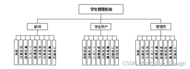 学生管理系统 在对需求做解析后,整个系统主要分为三个部分:管理员、教师、学生用户,每个模块下的分支功能不一样。对功能做出如下说明: