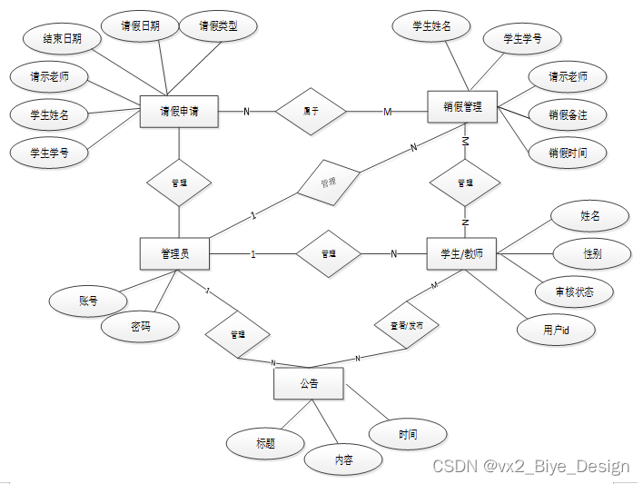 对于一个要开发的系统来说,E-R图可以让别人能更快更轻松的了解此系统的事务及它们之间的关系。根据系统分析阶段所得出的结论确定了在学生管理系统 中存在着多个实体分别是用请假申请、公告通知、防控登记、销假管理等。系统总体ER图如下图所示。