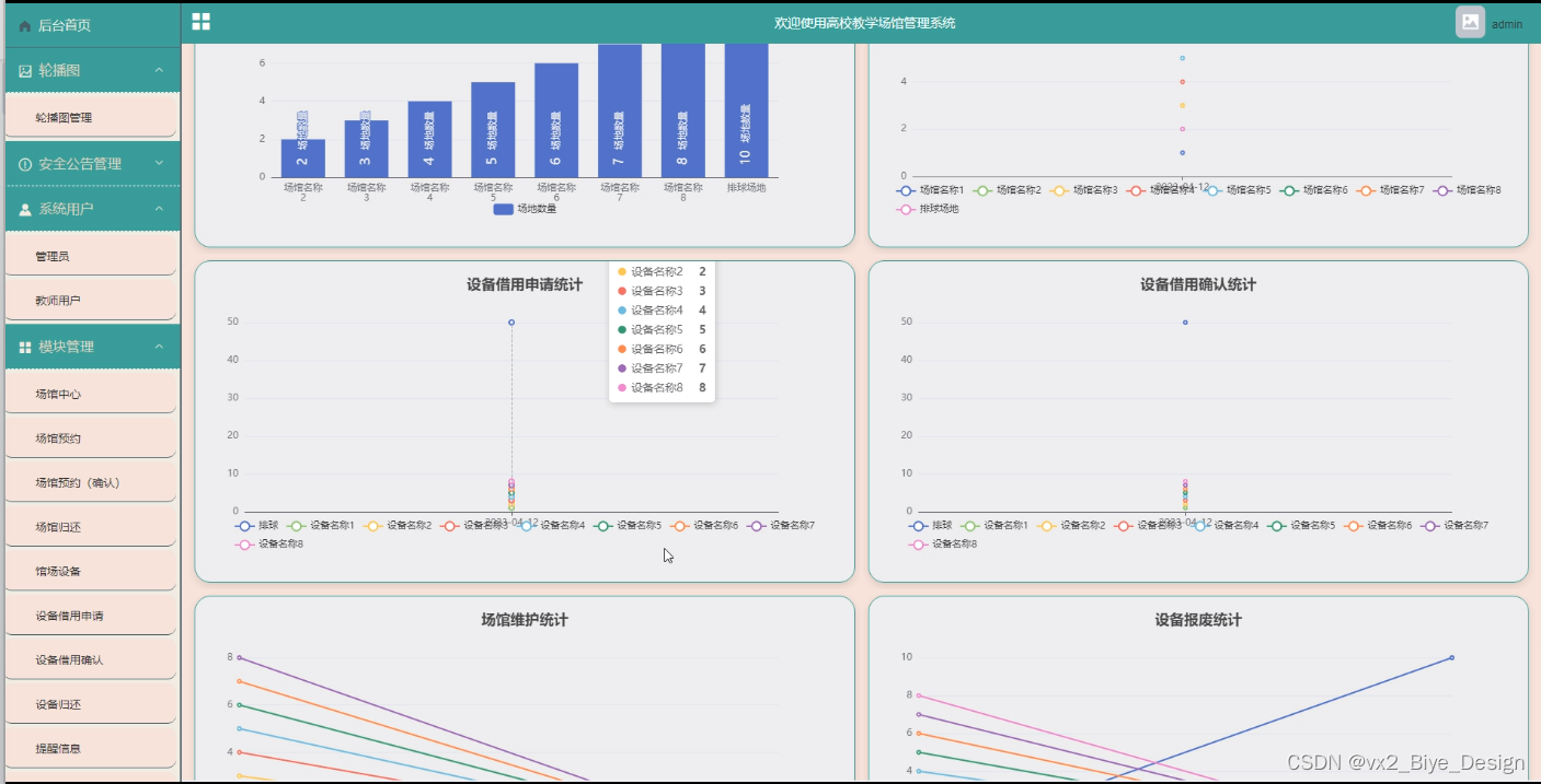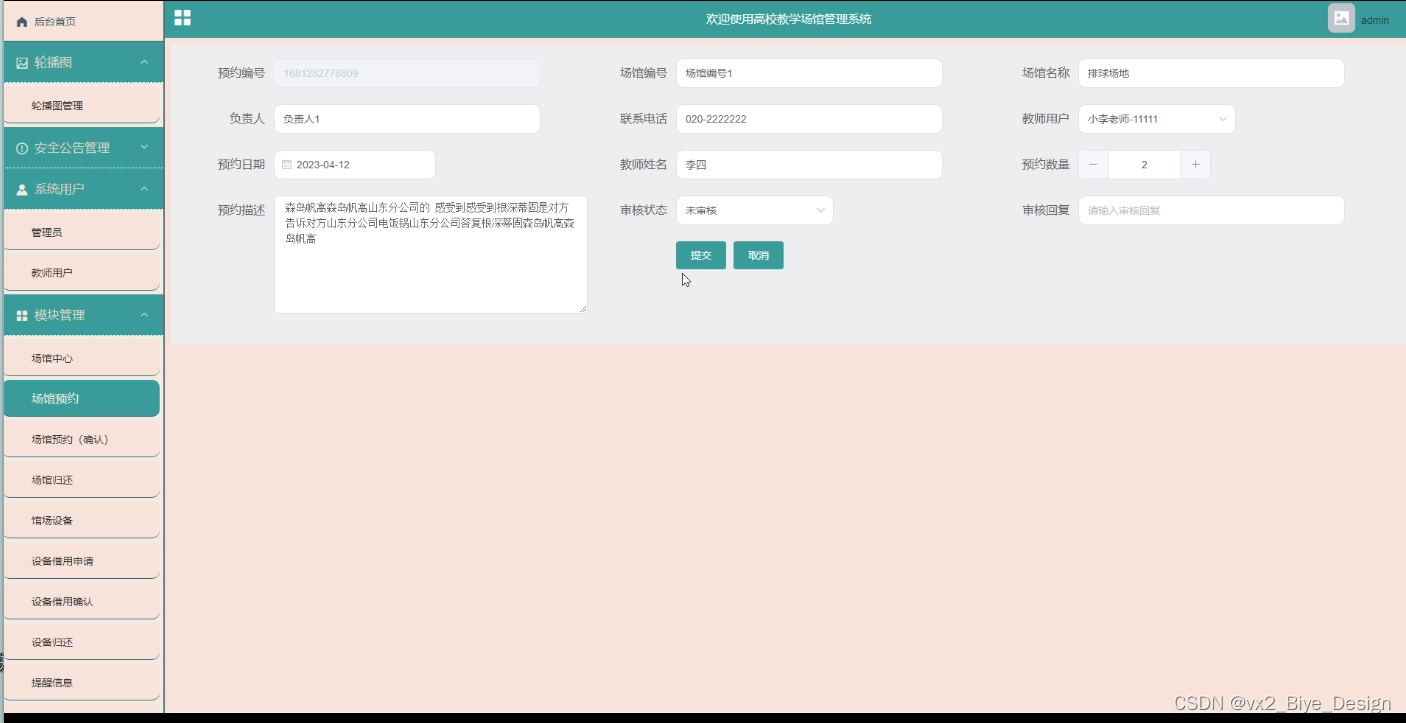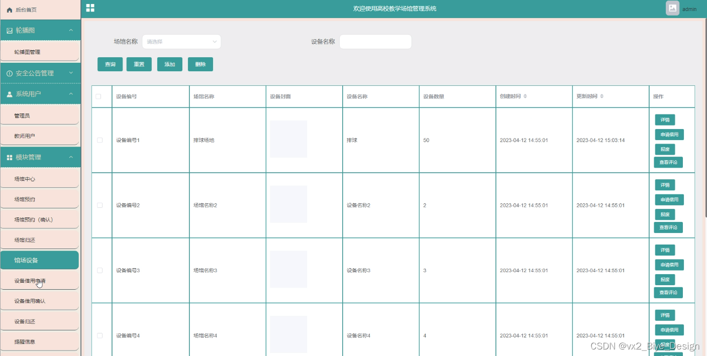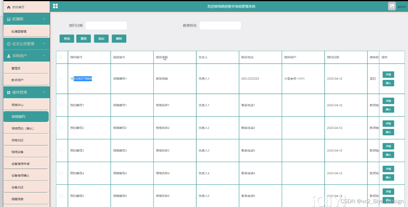 高校教学场馆管理系统在系统的手机上可以运行,主要实现了管理员;首页、轮播图(轮播图管理)、安全公告管理(安全公告)、系统 用户(管理员、教师用户)、模块管理(场馆中心、场馆预约、场馆预约(确认)、场馆归还、馆场设备、设备借用申请、设备借用确认、设备归还、提醒信息、场馆维护、设备报废)、个人中心;首页、模块管理(场馆预约、场馆预约(确认)、场馆归还、设备借用申请、设备借用确认、设备归还、提醒信息)、个人中心等主要功能模块的操作和管理。