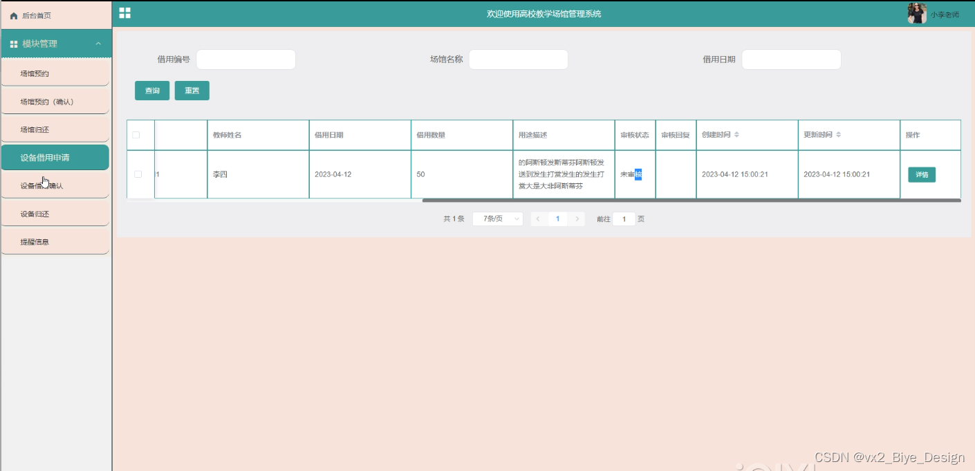 The development of a management system for teaching venues in universities makes the system more convenient and efficient, while also promoting a more systematic and orderly management system for teaching venues in universities. The system interface is relatively friendly and easy to operate.