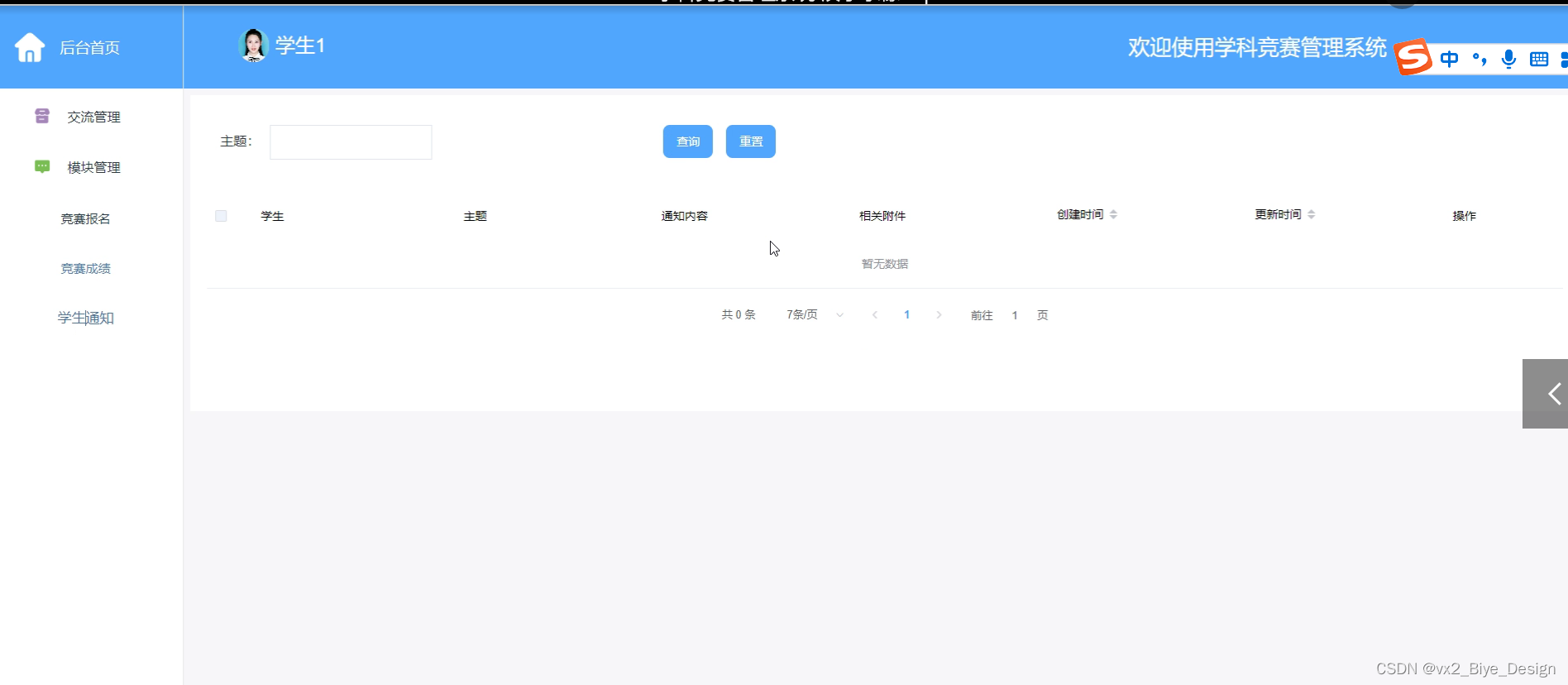 学生登录进入学科竞赛管理系统可以查看首页、竞赛交流、竞赛报名、竞赛成绩、学生通知等内容。如图5-11所示。