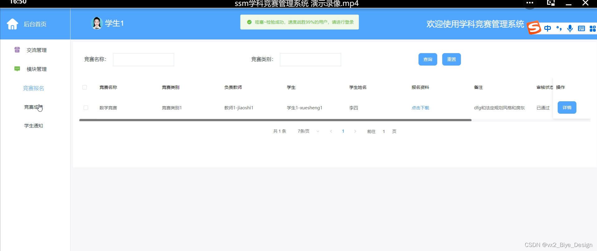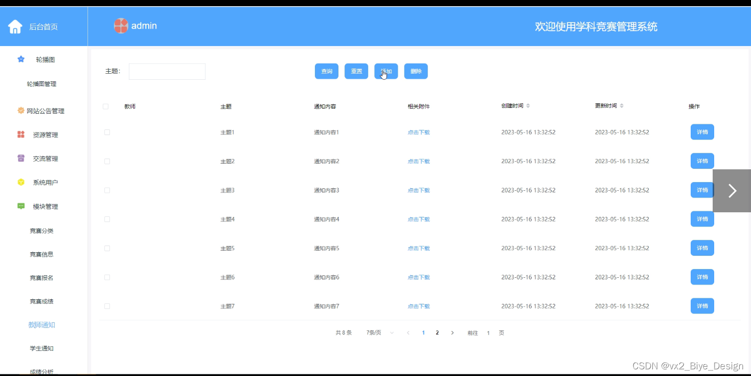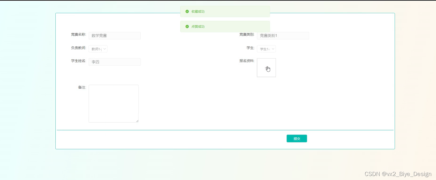 Specifically, in terms of system design, the B/S structure was adopted, and Java technology was also used for design on dynamic pages. MySQL database was used in the backend, making it an excellent subject competition management system.