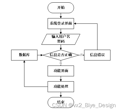 用户打开并进入系统后,会先显示登录界面,输入正确的用户名和密码,系统自动检测信息,若信息无误,则用户会进入系统功能界面,进行操作,否则会提示错误无法登录,操作流程如图3-3所示。