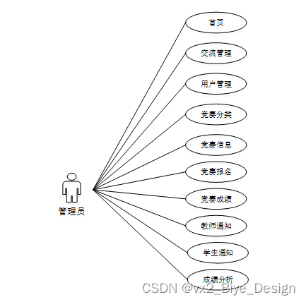 系统中的核心用户是系统管理员,管理员登录后,通过管理员菜单来管理后台系统。主要功能有:首页、轮播图、网站公告、资源管理(竞赛资讯、资讯分类)交流管理(竞赛交流、交流分类)系统用户(管理员、教师用户、学生用户)模块管理(竞赛分类、竞赛信息、竞赛报名、竞赛成绩、教师通知、学生通知、成绩分析)等功能。管理员用例如图3-7所示。