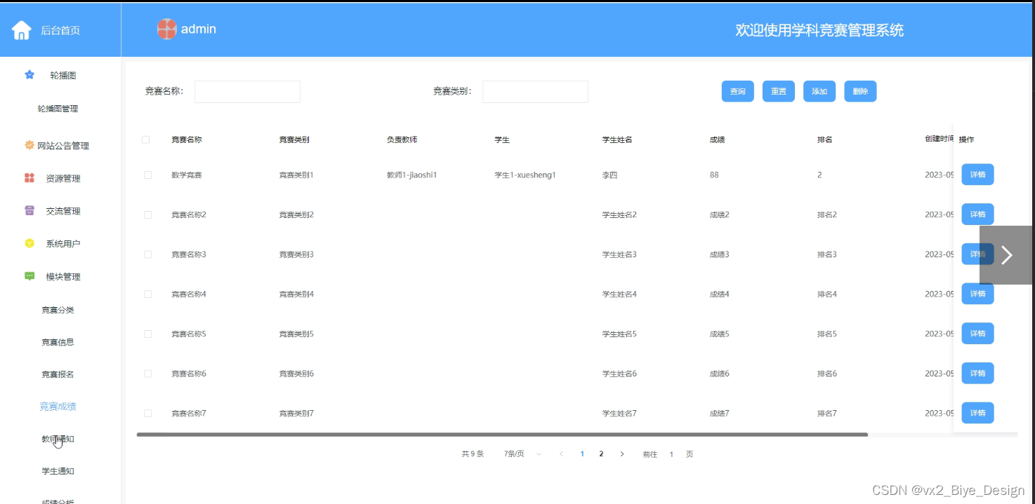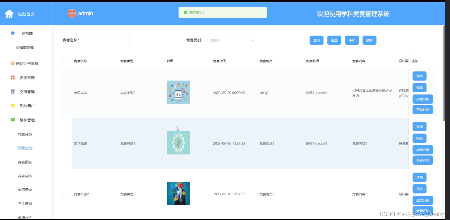 管理员对竞赛信息进行管控,可对竞赛信息进行增删改查、成绩分析、竞赛报名等信息操作,如图5-8所示。