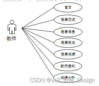 教师进入系统可以进行首页、交流管理(竞赛交流)模块管理(竞赛信息、竞赛报名、竞赛成绩、教师通知、成绩分析)等。教师用例如图3-9所示。