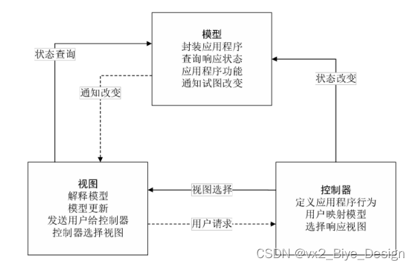 MVVM 就是将其中的View 的状态和行为抽象化,让我们将视图 UI 和业务逻辑分开。当然这些事 ViewModel 已经帮我们做了,它可以取出 Model 的数据同时帮忙处理 View 中由于需要展示内容而涉及的业务逻辑。它强制性的把应用程序的输入、输出和处理全部分开,将其分为三个核心部分,这三个部分分别有不同的功能。