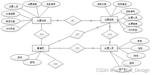 通过巡更系统的功能进行规划分成几个实体信息,实体信息将通过ER图进行说明,本系统的主要实体图如下: