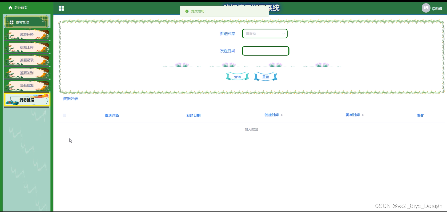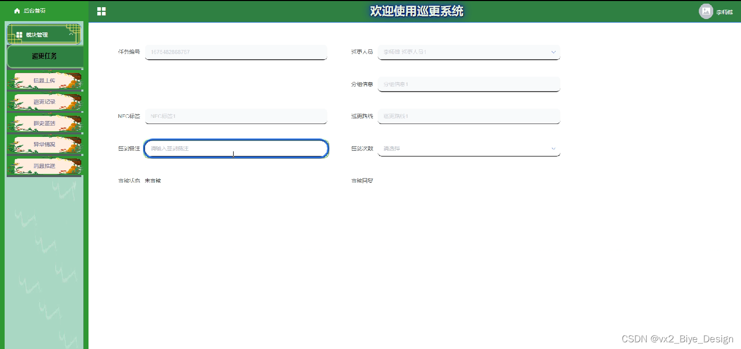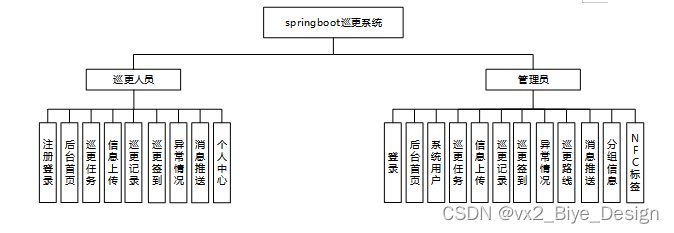(1)功能要求:后台首页,系统用户(管理中、巡更人员)模块管理(巡更任务、信息上传、巡更记录、巡更签到、巡更路线、异常情况、消息推送、分组信息、NTC标签)等功能模块。