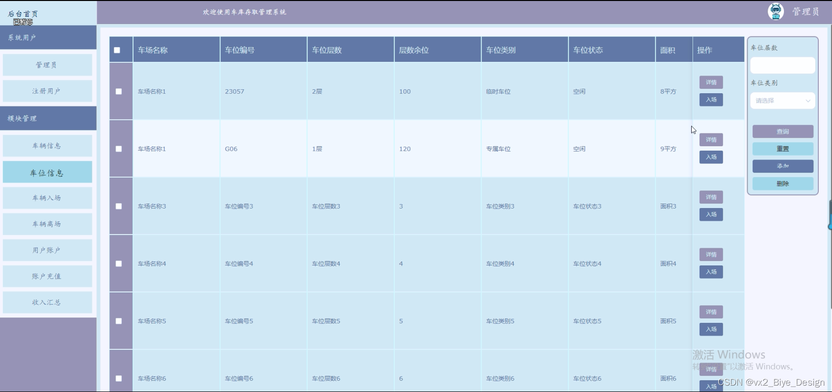 (4)车位信息:点击“车位信息”这一按钮可以查看到系统当中所有的车位信息,支持通过车场名称或者车位编号进行查询车位信息,如果想要添加新的车位,点击“添加”按钮,然后根据提示填写好车位的具体信息,点击提交所添加的车位信息在数据库就保存下来了,同时可以点击“入场”按钮,输入入场的用户信息进行提交,也可以选择要删除的车位直接点击“删除按钮”进行车位删除。