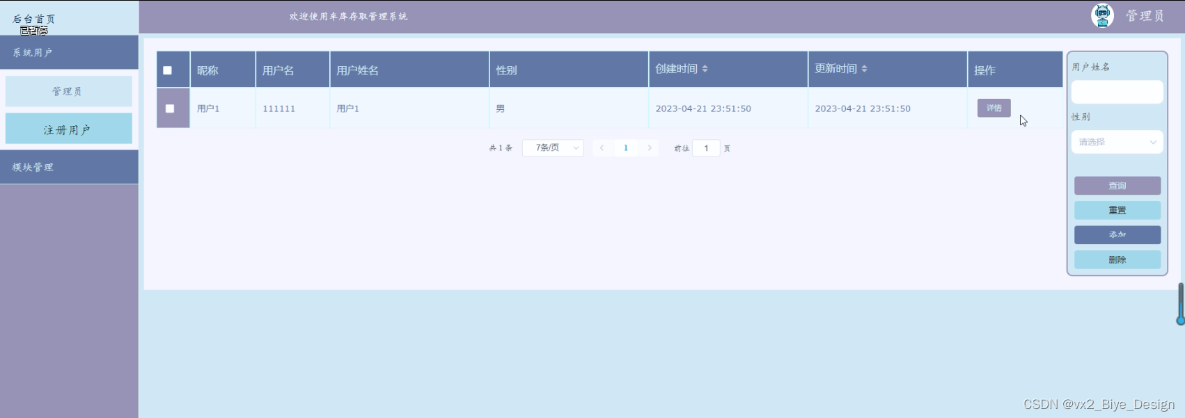 管理员可以对系统中所有的用户角色进行管控,包含了管理员以及用户这两种角色,如果需要添加新的用户,点击页面中的“添加”按钮根据提示输入上用户信息,点击“提交”以后在对应的用户界面就可以查看到了,可以点击用户后面的“删除”按钮直接删除某一用户,这里以注册用户为例。界面如下图4.5所示。