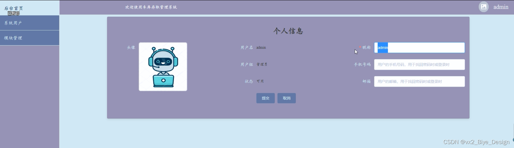 管理员和用户点击“个人信息”按钮,可以对个人的头像、昵称、手机号码等信息进行更新;个人信息界面如下图4.3所示。