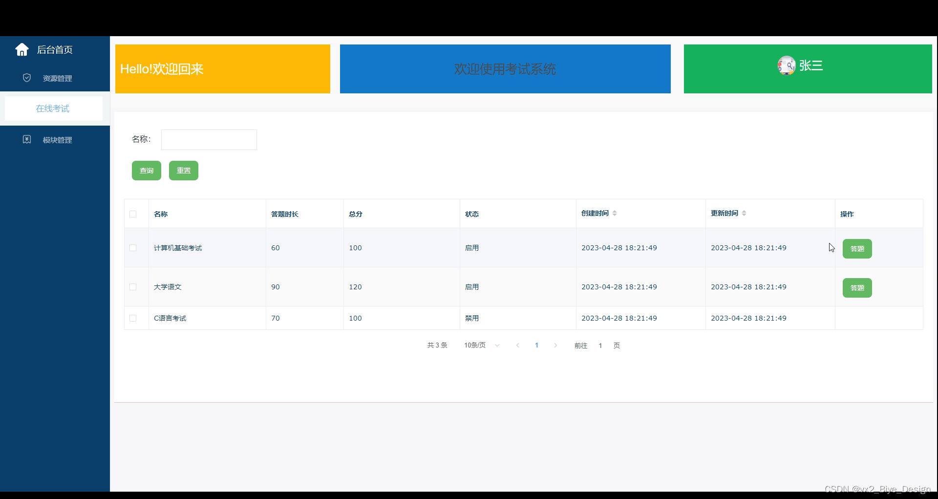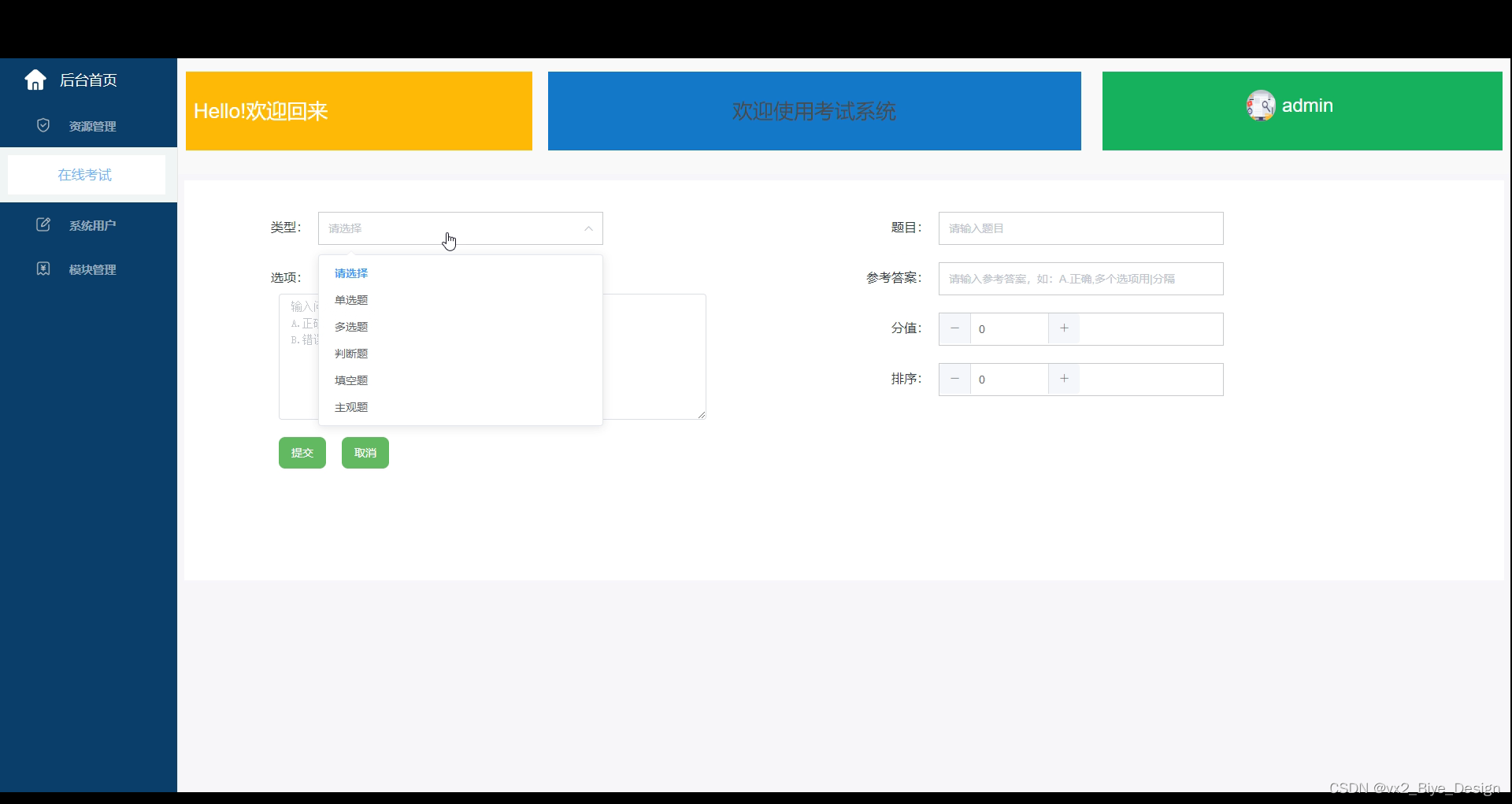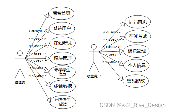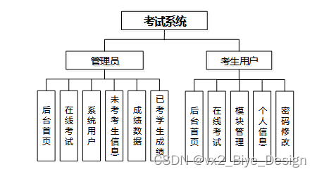 考试系统的主要使用者分为管理员和考生用户,实现功能包括后台首页,在线考试,系统用户(管理员,考生用户),模块管理(未考考生信息,成绩数据,已考考生成绩)等功能。