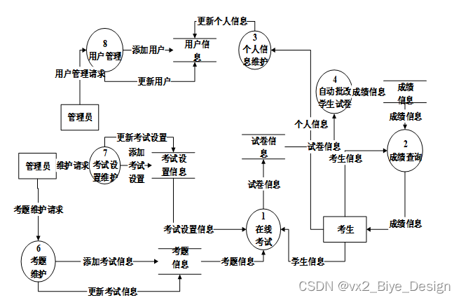 对系统的数据流进行分析,系统的使用者分为二类,考生用户,管理员。系统主要对界面信息传送,登录信息的验证,注册信息的接收,用户各种操作的响应做处理。