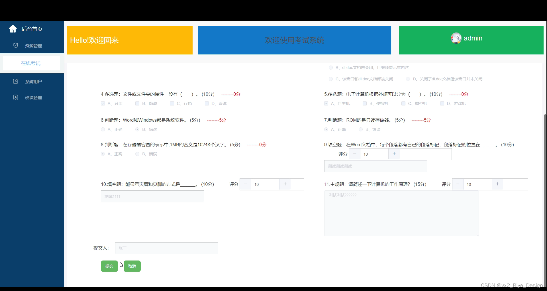 The use of this system can achieve the informatization of the exam system, making it convenient for candidates to participate in exams online and query scores. It also facilitates teachers to design question banks online, grade and change papers, maintain and count scores, and facilitate administrators to manage personnel more conveniently and quickly, greatly improving the efficiency of exams and grading.